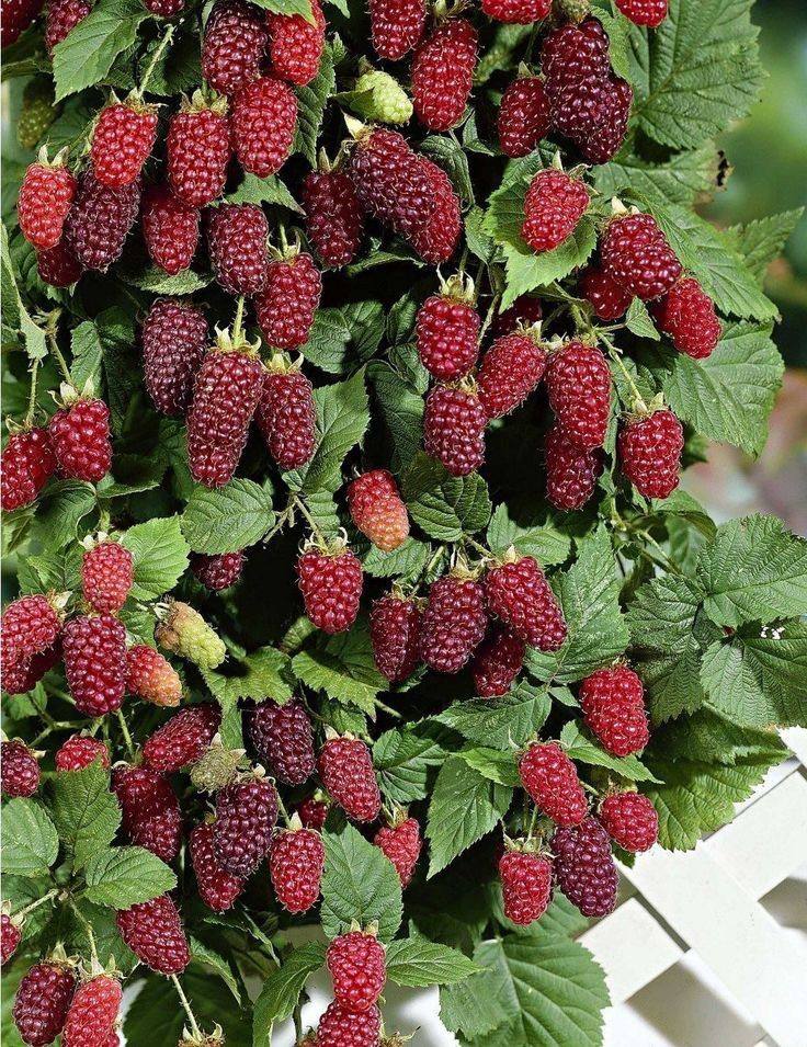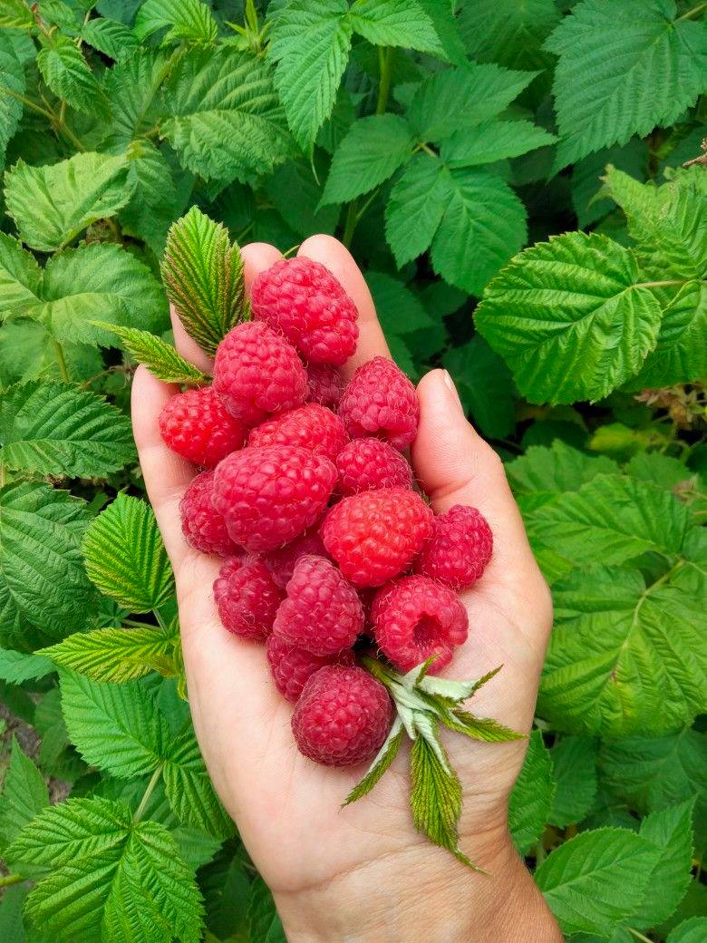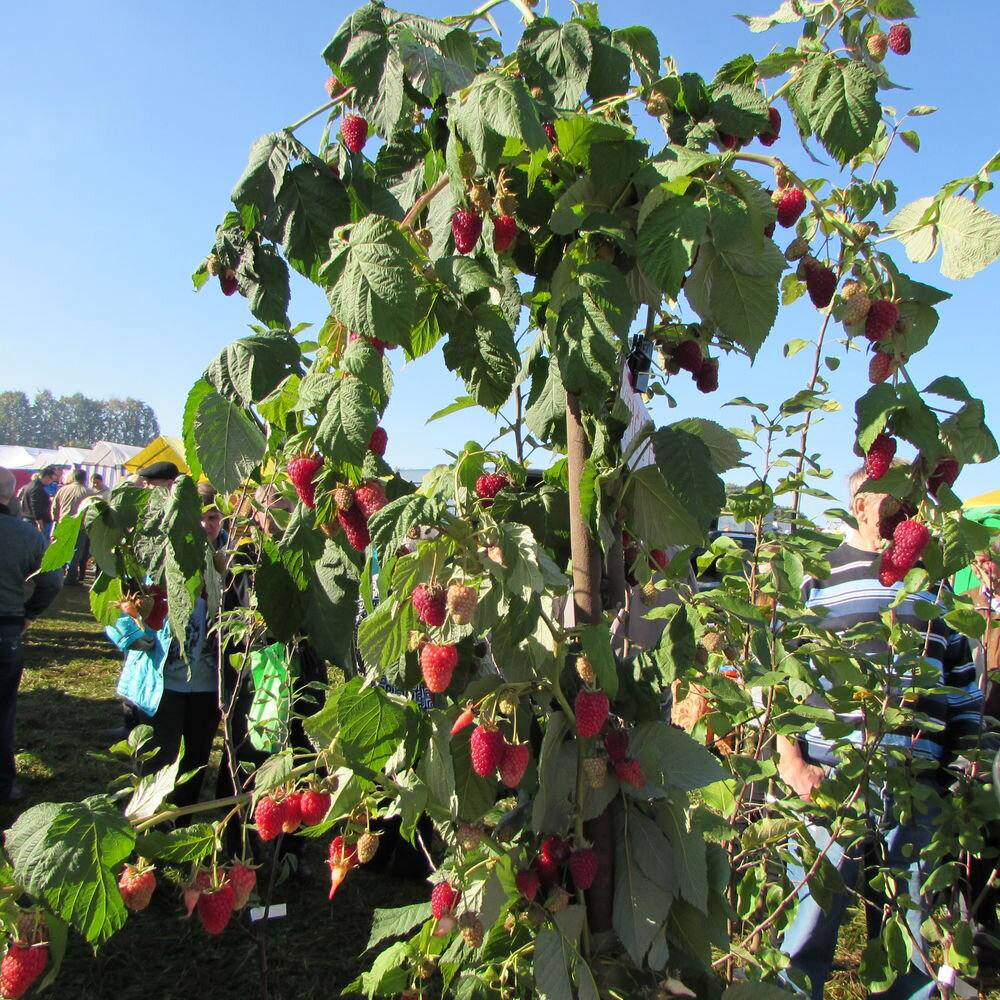 Малиновое дерево — современная форма садовой малины с мощными прямостоячими побегами, образующими компактный куст высотой до 1,5–2 м. Растение не требует подвязки и выглядит аккуратно, напоминая небольшое деревце.
